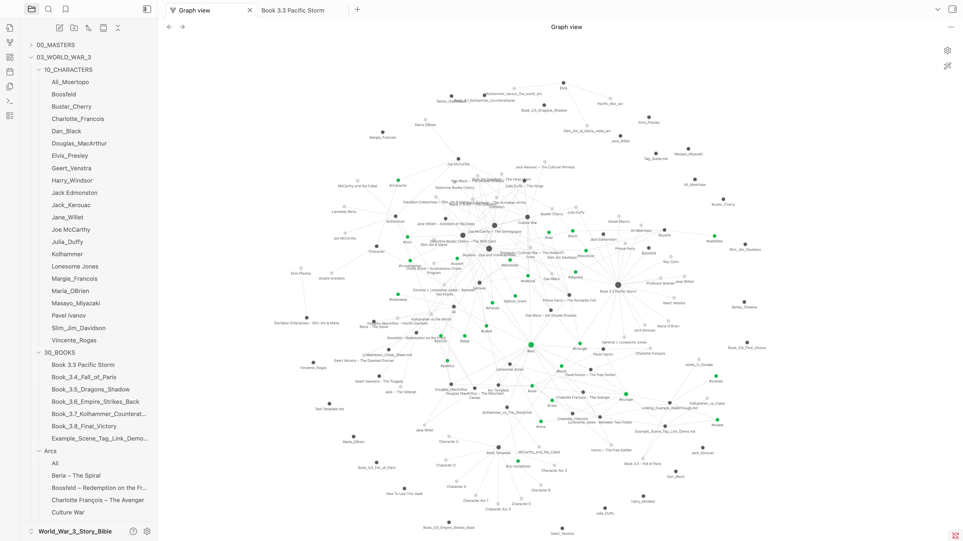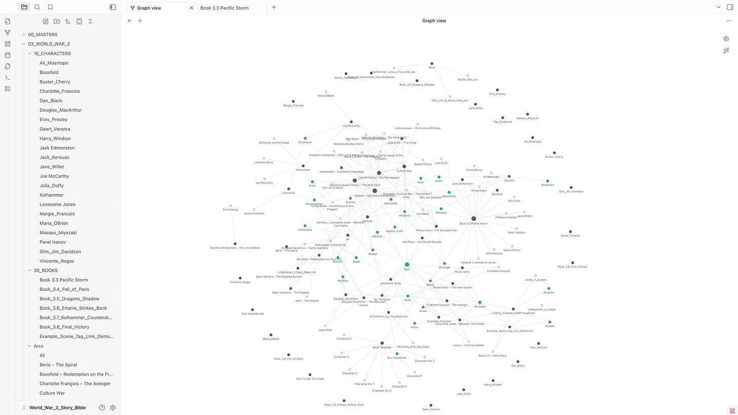 Finally, building this thing was as much about training myself as it was about scaffolding the books. I had to learn Obsidian, Markdown, linking, tagging, templates, YAML metadata. I had to get comfortable with the graph view, seeing my characters and story arcs as a web of nodes.