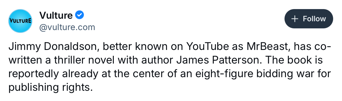 Set to drop in 2026 like a brand-collab killer asteroid crammed full of expired MrBeast Lunchables, this project has already triggered an eight-figure bidding war, a Hollywood adaptation frenzy, and an extinction-level cultural crisis for those of us in the publishing grift.